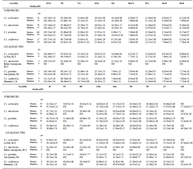 El porcentaje de clasificación correcta de los individuos machos por localidad tipo fue de 93.1%. De manera particular, el 100% de los individuos de C.c. achrustera fueron correctamente clasificados en la localidad tipo de La Paz, BCS, mientras que el 33% de los individuos de C.c. decolorata fueron correctamente clasificados en la localidad tipo de Bahía Concepción, BCS. Por su parte, el 100% de los individuos de C.c. plumbea fueron correctamente asignados a la localidad tipo de San Quintín, BC; y finalmente el 100% de individuos de C.c. californica fueron correctamente clasificados a la localidad tipo de Monterey, California, EUA.