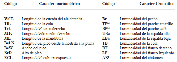 Seleccionamos las variables con base en los caracteres morfométricos propuestos por Pyle et al. (1997) y caracteres colorimétricos referidos en Grinnell (1926), Ridgway y Friedmann (1946) y Van Rossem (1946). Con el uso de un vernier digital (precisión 0.01 mm) tomamos nueve medidas morfológicas (mm) basadas en Pyle et al. (1997) (Cuadro 2, Figuras 6A y 6B).