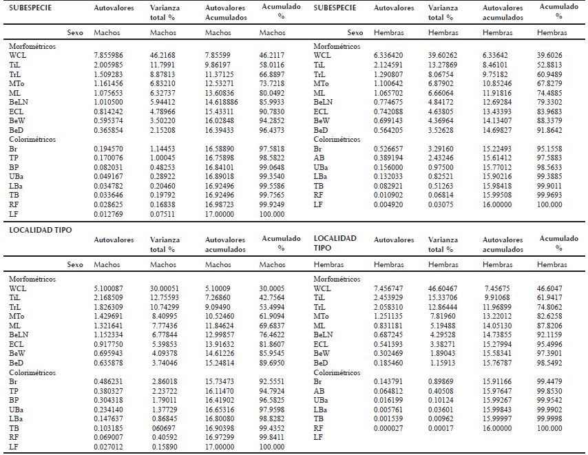 Realizamos un análisis de componentes principales (ACP) para identificar las variables fenotípicas más importantes en la formación de grupos y para determinar el patrón de variación de caracteres fenotípicos (morfométricos y coloración) entre las subespecies. Este método estadístico permite determinar la contribución de un conjunto de variables intercorrelacionadas (componentes principales) sobre un problema sin la pérdida de información (Aldás y Uriel 2017).