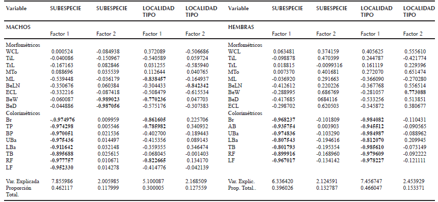 Hembras: Los dos primeros factores explicaron el 52.88% de la varianza (Cuadro 3). El factor 1 con el 39.60% de la varianza está integrado, al igual que en los machos, por todas las medidas de color (Br, AB, UBa, LBa, TB, RF, LF); mientras que el Factor 2 no está determinado por ninguna medida en particular (Cuadro 3, 4 y Figura 8B).