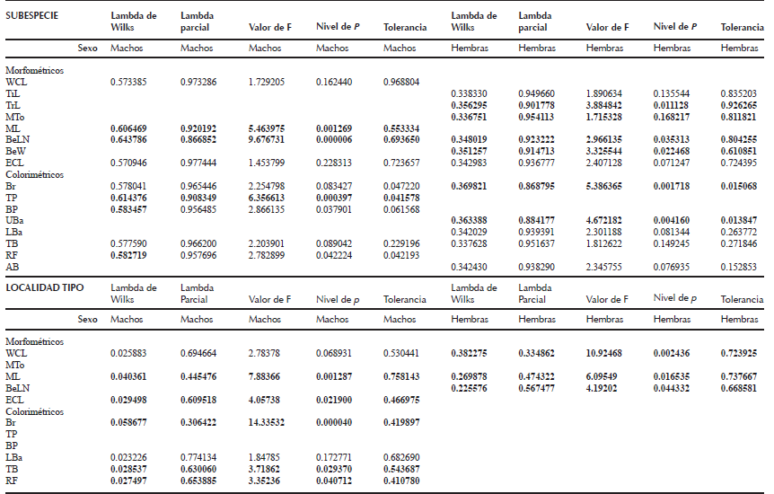Los caracteres morfológicos y colorimétricos que permitieron con el valor de Lambda de Wilks a una mayor discriminación entre las poblaciones de C. californica se encontró en la categoría de localidad tipo para ambos sexos (machos, λ = 0.02 y hembras, λ = 0.13).