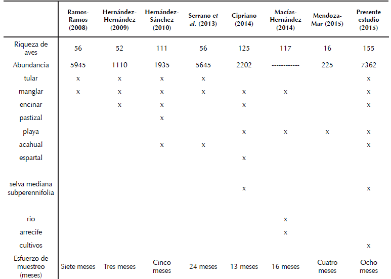 Con base en la priorización de los estudios, se registró que el presente estudio fue el que aportó la mayor riqueza de especies, esto puede atribuirse al esfuerzo de muestreo y el horario en el que se realizaron los muestreos en relación con los estudios previos. En esta investigación realizamos muestreos en horario vespertino donde encontramos especies que no habían sido registradas previamente en la zona, como Nyctidromus albicollis, Glaucidium brasilianum y Chordeiles minor. El segundo estudio que aportó regionalmente nuevas especies (40), tanto migratorias como playeras fue el de Macías-Hernández (2014), quien incluyó una variada representación espacial al incluir varios sitios de muestreo, pero también fue el estudio con mayor tiempo de muestreo (15 meses).