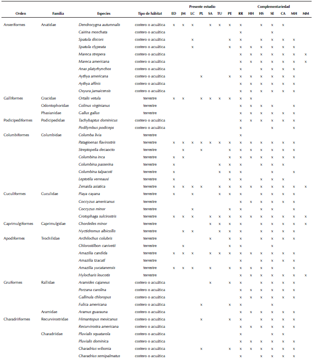Para analizar diferencias en el uso de hábitat, las aves se clasificaron en tres categorías: marinas, costeras o acuáticas y terrestres (Peterson y Chalif 1989, Howell y Webb 1995). Las diferencias estadísticas en la proporción de especies por gremios alimenticios y la proporción de especies por tipo de hábitat las determinamos mediante la prueba no paramétrica de G de tablas de contingencia (Zar 2010).