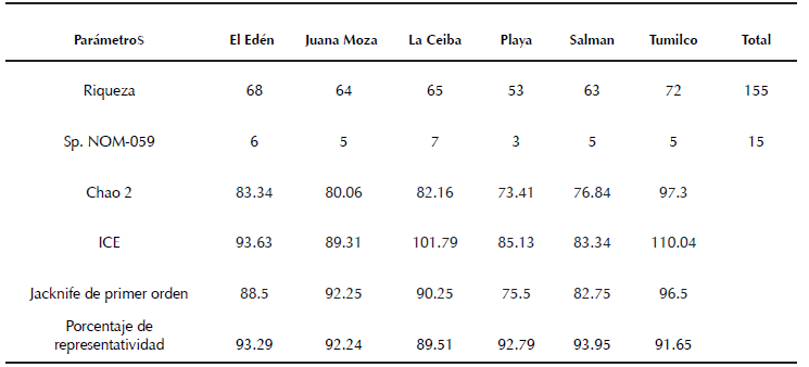 En total, en los seis sitios de muestreo registramos 155 especies de aves pertenecientes a 118 géneros, 41 familias y 20 órdenes. La familia Parulidae fue la mejor representada, con 16 especies, y el orden Passeriformes el más numeroso, con 16 familias (Anexo 2). Tumilco fue el sitio con la mayor riqueza de especies (72 especies), mientras que la menor riqueza (53 especies) la registramos en La Playa (Figura 2). El porcentaje de representatividad de los sitios fue entre el 70 y 80% con base en los estimadores empleados, se infiere que aún podrían albergar una mayor cantidad de especies (Cuadro 1).