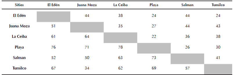 Analizando el recambio de especies, encontramos que La Ceiba y La Playa fueron los más complementarios entre sí (78%) compartiendo 22 especies, mientras que los sitios con menor complementariedad fueron Tumilco y Juana Moza (34%), los cuales comparten 44 especies entre sí (Cuadro 2).