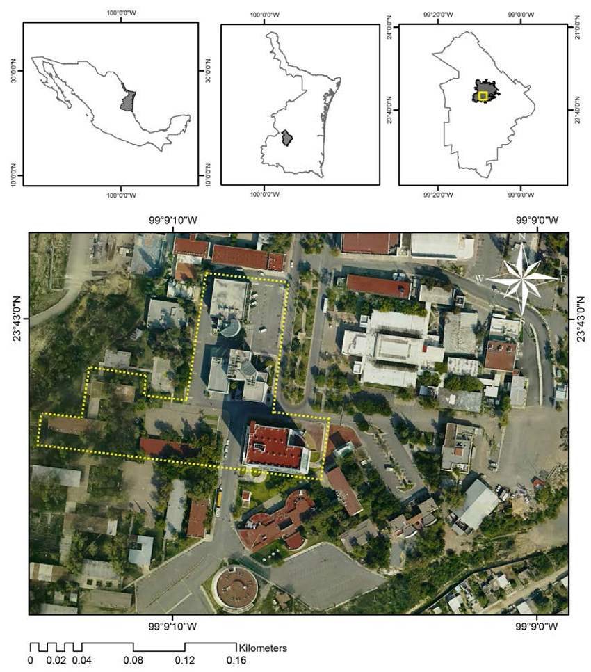Nuestra investigación la realizamos en el Centro Universitario Victoria (CUV) perteneciente a la Universidad Autónoma de Tamaulipas (UAT) y ubicada en la parte suroeste de la capital del estado (23º43’15.4” N, 99º09’04.9” O; 365 msnm; Figura 1). El CUV tiene una superficie de 41.24 ha y está conformado por cinco facultades, un estadio, un gimnasio, seis estacionamientos y distintas áreas verdes (remanentes de matorral espinoso tamaulipeco, campos de futbol, viveros, jardineras y jardines). Las especies de árboles predominantes en las áreas verdes son la casuarina (Cassuarina cunninghamiana), el fresno blanco (Fraxinus americana), el neem (Azadirachta indica), el framboyán (Delonix regia), la palma mexicana (Washingtonia robusta), el eucalipto (Eucalyptus globulus), el ficus de hoja pequeña (Ficus benjamina), el ébano (Ebenopsis ebano), el San Pedrito o tronadora (Tecoma stans), el olmo (Populus mexicana) y la pata de vaca (Bahuinia divaricata) (Elizondo 2009, Mora-Olivo y Martínez-Ávalos 2012, observaciones de campo).