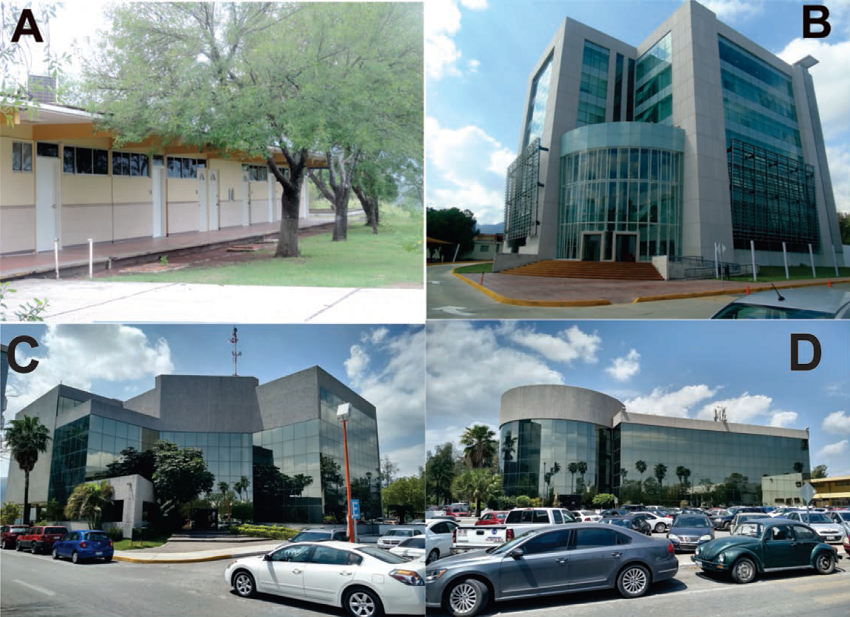 Para la detección, colecta e identificación de las aves, entre agosto de 2015 y septiembre de 2016 realizamos recorridos a lo largo de rutas permanentes dentro del CUV. Los recorridos fueron realizados por dos observadores que buscaron de manera independiente aves muertas a tres metros de distancia de cada uno de los edificios, así como observaciones directas para identificar aves aturdidas por colisión en los edificios; ambos métodos los realizamos dos veces por día uno durante la mañana entre 09:00-10:00 h, y otro durante la tarde entre 16:00-17:00 h con una revisión de 15 min por edificio (Figura 2). Una vez identificados los cuerpos de las aves, observamos las características que presentaban (pérdida de plumas en el cráneo, hemorragias visibles en ojos y pico) causados por los choques contra las ventanas de las instalaciones.