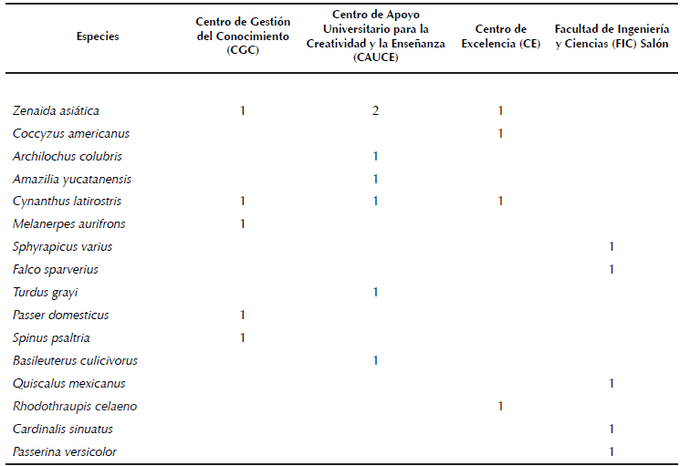 En total registramos 21 aves que colisionaron en las ventanas del CUV que corresponden a seis ordenes, 11 familias y 16 especies. El 50% de las especies que colisionaron fueron residentes, el 43.7% fueron migratorias y una especie introducida (Passer domesticus). Del total de colisiones, 16 eventos fueron fatales y cinco aves sobrevivieron. El 57% de las aves colisionadas fueron hembras y el 43% fueron machos, incluido un juvenil. Las especies con mayor número de colisiones fueron Zenaida asiatica (N = 4) y Cynanthus latirostris (N = 3). Además identificamos una hembra de una especie endémica del noreste de México, Rhodothraupis celaeno (Cuadro 2). El mayor número de colisiones ocurrió en edificios con vidrios reflejantes con el 76.2% y en las instalaciones de más de dos niveles o pisos (entre 12 y 20 m de altura). El Centro de Apoyo Universitario para la Creatividad y la Enseñanza (CAUCE) presentó el mayor porcentaje de colisiones con el 35%, seguido de los edificios del Centro de Gestión del Conocimiento (CGC) con el 25%, y el Centro de Excelencia (CE) y los salones de clase de la FIC, ambos con el 20% (Cuadro 3). Finalmente, la estación con mayor número de colisiones fue primavera (marzo a junio) con un total de nueve eventos; posteriormente fue el verano (junio a septiembre ) con siete. Mientras que otoño (septiembre a diciembre) (cuatro) e invierno (diciembre a marzo) (uno), aportan los valores más bajos.