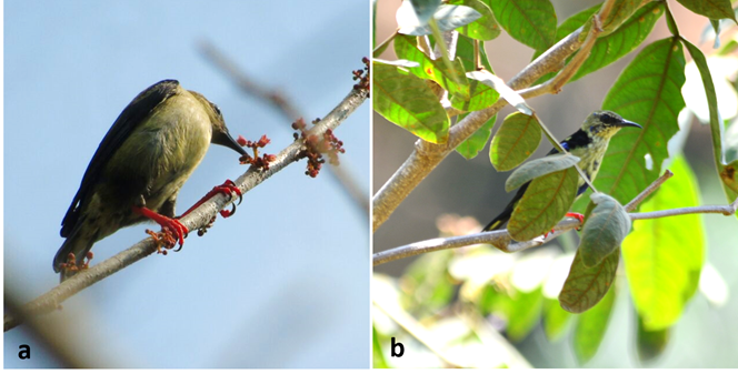 El 11 de enero de 2017 a las 14:13 h, en Jolotichán, observamos una parvada de 10 individuos de C. cyaneus forrajeando en un árbol de parota (Enterolobium cyclocarpum); posteriormente, el 25 de enero de 2017 a las 12 h, registramos un individuo hembra en un árbol de cacahuananche (Gliricidia sepium) y un año después, el 5 de enero de 2018 a las 14:00 h, registramos cinco individuos forrajeando en las flores de un árbol de ciruelo (Spondias purpurea; Figura 1). Asimismo, el 13 de enero de 2017 a las 14:24 h, en la localidad El Mango, municipio de San Luis Acatlán (17°02’18.12” N, 98°43’20.69” O, 1008 msnm), registramos casualmente una parvada de más de 10 individuos del mielero pata roja forrajeando en una huerta mixta de café (Coffea arabica) y plátano (Musa paradisiaca), con árboles dispersos de parota (E. cyclocarpum) e Inga vera, entre otras especies. El tipo de vegetación presente en la localidad de Jolotichán es de un ambiente urbano, con predios arbolados con elementos de selva mediana subcaducifolia, mientras que, en la localidad El Mango la vegetación es selva mediana subcaducifolia relictual en una matriz de huertas de café y plátano.