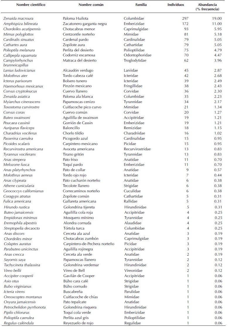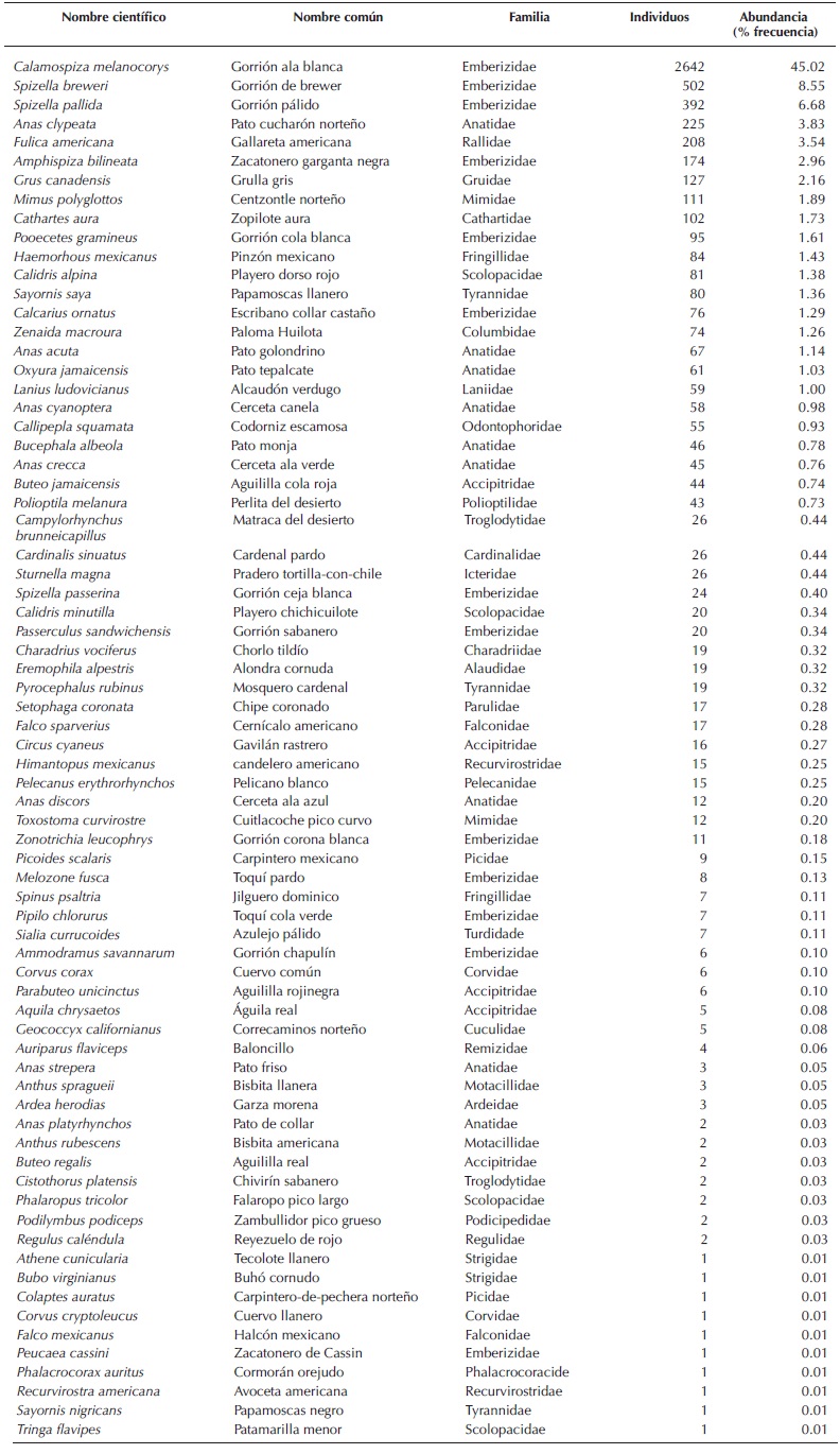 La especie con el mayor número de individuos registrada durante los seis años fue el gorrión de ala blanca (Calamospiza melanocorys) con 4,553. Sin embargo para cada uno de los años de muestreo la especie más registrada varió siendo que en 2012 el gorrión de garganta negra (Amphispiza bilineata) presentó 177 individuos, en 2013 el pato cucharón norteño (Anas clypeata) con 408, 2014 el gorrión de ala blanca con 1,537, en 2015 la gallareta americana (Fulica americana) con 469, 2016 la paloma huilota (Zenaida macroura) con 154 y en 2017 otra vez el gorrión de ala blanca fue el más registrado con 2,642. Observamos que la especie con la mayor abundancia en cada una de las temporadas fue variable, aunque en febrero de 2014 y 2017 el gorrión de ala blanca mostró la mayor abundancia. En el caso del mes de junio la especie que observamos con mayor abundancia fue la paloma huilota durante 2013, 2016 y 2017, y el gorrión de garganta negra en 2012 y 2014.