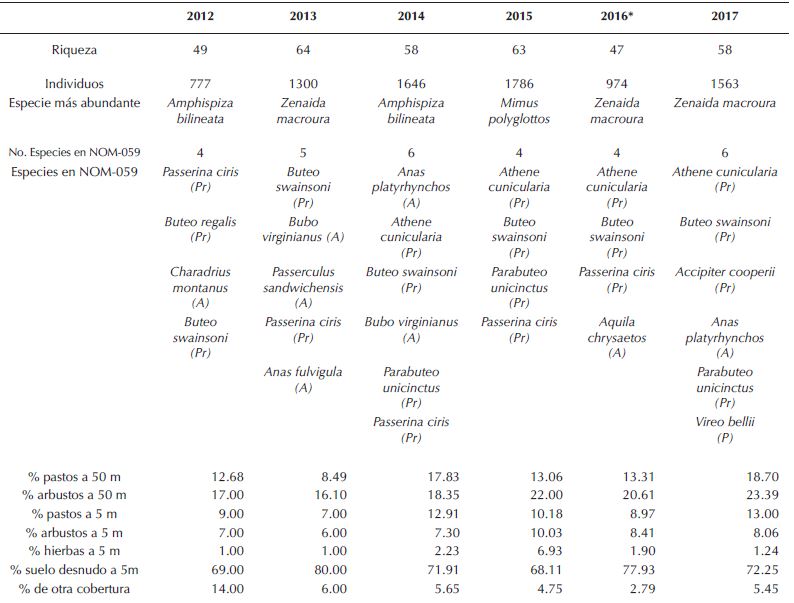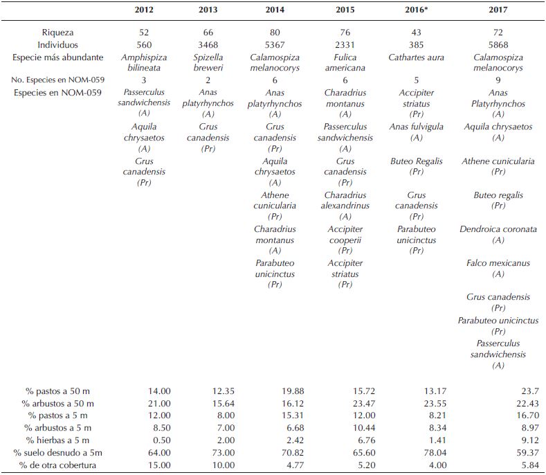 Registramos 18 especies que están incluidas en la NOM-059-SEMARNAT-2010, 14 en febrero y 13 en junio, de estas 8 se encuentran como sujetas a protección especial (Pr), 9 como amenazadas (A) y 1 en peligro de extinción (P). Observamos un incremento al pasar de 3 especies observadas en febrero del 2012 a 9 especies en febrero del 2017; así como de 4 especies en junio del 2012 a 6 especies en junio del 2017. Registramos la grulla gris (Grus canadensis) en todos los años de muestreo. Observamos el pato de collar (Anas platyrhynchos), el águila real (Aquila chrysaetos), la aguililla de Harris (Parabuteo unicinctus) y el gorrión sabanero (Passerculus sandwichensis) en 3 de los 6 años. Mientras que a la lechucita pocera (Athene cunicularia), la aguililla real (Buteo regalis) y el gavilán de pecho rufo (Accipiter striatus) la registramos en dos años. Otras especies que registramos en un solo año fueron el chipe de rabadilla amarilla (Setophaga coronata), el halcón mexicano (Falco mexicanus), el chorlito llanero (Charadrius montanus), el chorlito nevado (Charadrius alexandrinus) y el gavilán de Cooper (Accipiter cooperii).