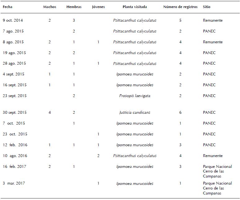Adicionalmente hicimos observaciones en el Parque Nacional Cerro de las Campanas (58 ha) (20°35’36.30” N, 100°24’38.99” O) donde se encuentran árboles de palo bobo (I. murucoides) y visitas esporádicas en un remanente de vegetación (1.98 ha) (20°33’46.08” N, 100°25’2.49” O) dentro de la ciudad de Querétaro, compuesto por árboles de mezquite (Prosopis laevigata) y huizaches (A. farnesiana) cubiertos por flores de muérdago (Psittacanthus calyculatus).