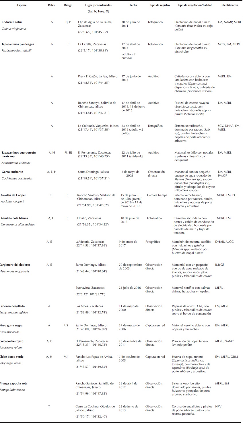 Descripción del financiamiento: Ian MacGregor-Fors, Noé Abraham Muñoz-Padilla, Manuel Peinado Arellanes, David Humberto Almanzor Rojas, Santiago Cortés Vázquez, Noé Pérez Valadez, Melinda Cárdenas García, Jaime Luévano, Óscar Baez Montes y Andrea Liliana Godínez Carvente proporcionaron apoyo durante el trabajo de campo. Los registros que OBM y ALGC anotaron en AverAves y Naturalista, respectivamente, son observaciones realizadas durante nuestros proyectos, bajo nuestra supervisión y con apoyo económico de los mismos. Ezequiel Martínez y Margarita Chávez proporcionaron apoyo logístico; Phil Unitt (San Diego Natural History Museum) verificó algunos ejemplares fotográficos. Varios propietarios y responsables nos permitieron el acceso a sus predios, especialmente la familia Santoyo y Melquiades Contreras. Alberto Macías-Duarte, un revisor anónimo y el editor asociado hicieron numerosas y acertadas sugerencias que permitieron mejorar la calidad de este artículo. Martín Yáñez contribuyó de manera importante a la edición final de este artículo. A todos ellos agradecemos profundamente su apoyo. Las observaciones reportadas se realizaron en el contexto de diferentes proyectos con financiamiento de SIMORELOS-Conacyt (19980306025 y 20000306003), Fondo Mixtos Jalisco (FOMIX 2009/125638), Consejo Nacional de Ciencia y Tecnología (Ciencia Básica-2010-01/157186) y con recursos de la Universidad de Guadalajara y del Centro de Investigación Científica y de Educación Superior de Ensenada, B.C. La versión inicial de este artículo fue preparada mientras MERL se encontraba en una estancia sabática en la Université de Franche-Comté, Francia y EM en una estancia sabática en el Institut Universitaire de France, apoyados por el Consejo Nacional de Ciencia y Tecnología (Conacyt).