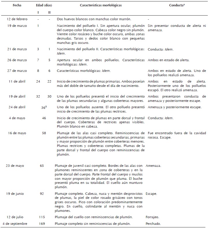 El 19 de abril, con 32 y 30 días edad, uno de los polluelos presentó el inicio del crecimiento de las plumas secundarias y algunas coberteras mayores. Ambos polluelos presentaron la misma conducta amenazante mediante siseo y extensión de alas, con un inmediato escape hacia una sección de la cavidad que nos imposibilitaba observarlos.
