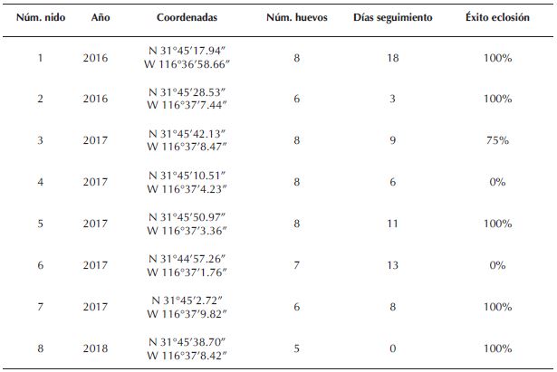 Durante este estudio encontramos ocho nidos, dos en 2016, cinco en 2017 y uno de manera fortuita en 2018 (Figura 1, Cuadro 1). En 2017 solamente dos nidos fracasaron a media temporada debido a las mareas altas en los sitios 4 y 6. En el Cuadro 1 reportamos año de anidación, ubicación geográfica, número de huevos y éxito de eclosión de los nidos. La media de eclosión fue de 7.0 huevos, DE = 1.20.