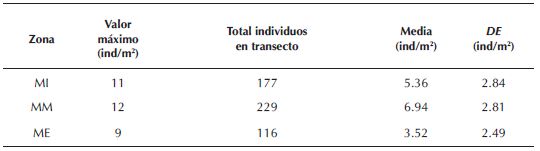 La mayor densidad que registramos del bivalvo G. demissa fue en la Marisma Media (MM) 6.94 ind/m2 y la menor en la Marisma Externa (ME) 3.52 ind/m2) (Cuadro 2), las densidades fueron diferentes entre las tres zonas (X2 = 36.77, gl = 2, p < 0.001).