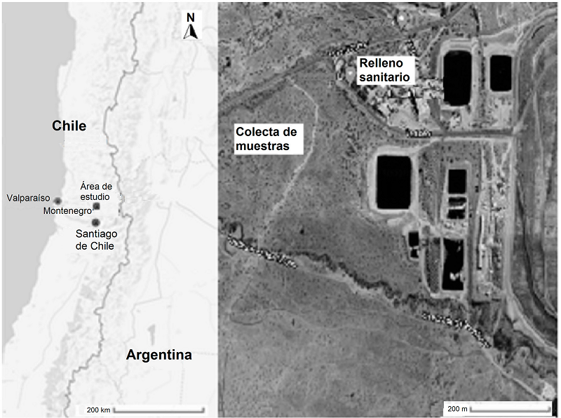 Nuestro estudio fue en Montenegro (32º52’00” S-70º51’00” O), una localidad urbana de Chile Central, situada a 55 kilómetros de Santiago de Chile, próximo a la Cordillera de la Costa (Figura 1). Posee una vegetación de tipo esclerófila, en la que predomina la formación forestal bosque espinoso abierto, representada por el espino Acacia caven (Gajardo 1995), en conjunto con Prosopis chilensis. El clima es de tipo mediterráneo, de la forma semiárido templado (Di Castri y Hajek 1976). En su proximidad (1 km) se encuentra en operación desde 2017 un relleno sanitario de 800 ha que recibe los desechos sólidos de la ciudad de Santiago de Chile.