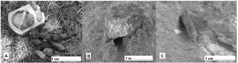 Durante diciembre de 2018 recorrimos el área de estudio en busca de egagrópilas de ambas especies. Éstas las diferen ciamos en torno a sus sitios de actividad, los que presentaron particularidades estructurales. En el caso del tiuque, existió preferencia por árboles de Acacia caven con amplia cobertura de dosel (Figura 2A), mientras que en el caso del pequén fueron guaridas establecidas a nivel del suelo, con baja cobertura de vegetación (Figura 2B). La identificación de las egagrópilas colectadas fue de acuerdo a su forma y tamaño (Muñoz-Pedreros y Rau 2004). Cada egagrópila la guardamos en bolsas de papel etiquetadas para su análisis posterior.