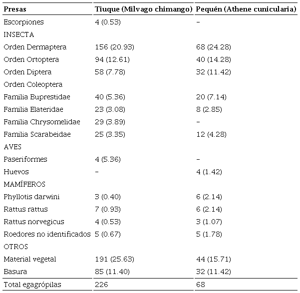 Colectamos un total de 294 egagrópilas (226 para el tiuque, M. chimango, y 68 para el pequén, A. cunicularia). Obtuvimos un total de cinco categorías tróficas (artrópodos, aves, mamíferos, material vegetal y basura -residuos plásticos-). Dentro de éstos, los artrópodos obtuvieron la mayor representación (Cuadro 1), la clase Insecta fue la de mayor riqueza (cuatro órdenes, dentro de las cuales, en el Orden Coleoptera, registramos cuatro familias). En ambas especies observamos una dominancia del consumo de la clase Insecta, pero fue mayor en el pequén que en el tiuque (Cuadro 1), con una distinta frecuencia para cada especie. Asimismo, se diferenciaron en la frecuencia de consumo de mamíferos (roedores) y de aves, así como del material vegetal (semillas y pastos), donde la frecuencia de consumo fue superior en el caso del tiuque.