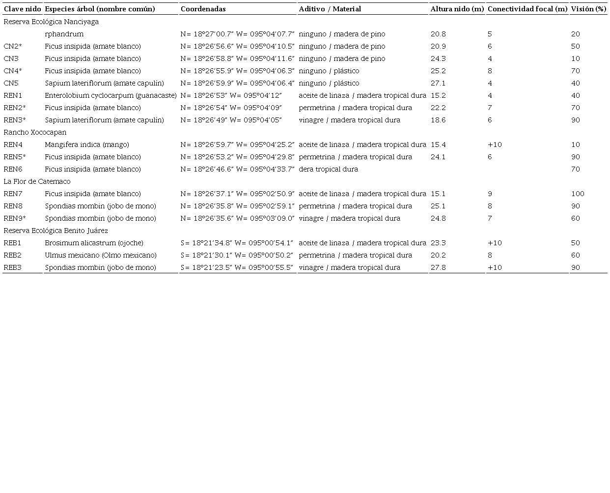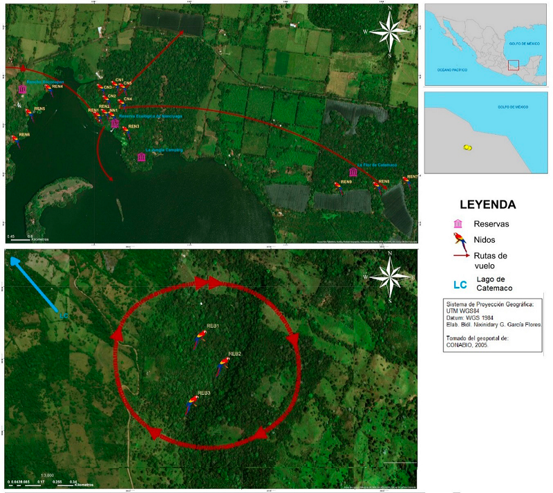 Todos los nidos los georreferenciamos (GPS Garmin®), numeramos y ordenamos de acuerdo con prefijo de su zona (REN = Reserva Ecológica Nanciyaga, REB = Reserva Ejidal Benito Juárez) y su orden de instalación. Las coordenadas, altura de la caja nido, aditivo, especies de árbol de instalación, conectividad focal y visión periférica se muestran en la Cuadro 1. Durante la instalación de las cajas-nido, y a través de la observación de interacciones positivas registramos la existencia de seis parejas de guacamayas dentro de la población en REN y anexas.