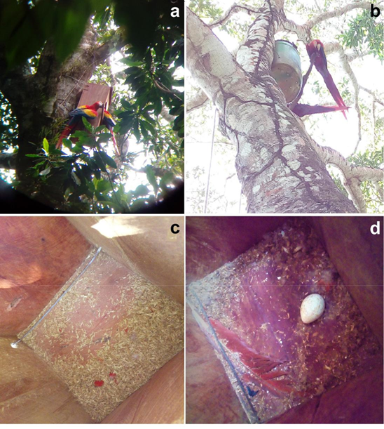 Tanto los nidos de madera como los de plástico fueron visitados por las guacamayas, sin embargo, los nidos de madera tropical podrían proporcionar una ventaja adaptativa al servir como enseñanza para la preparación de un nido natural, ya que de ellos han aprendido a desprender viruta para el fondo del nido.