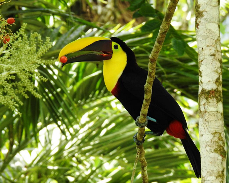 Toucans (Ramphastidae) are a very striking group of birds, brightly colored with a very large beak. The family is comprised of about 50 species with a distribution restricted to Central and South America (Guimarães Santos and Sousa De Paula 2019). The Yellow-throated Toucan (Ramphastos ambiguus) is predominantly black, and has feathers with brown tips, a yellow bib covering the throat and chest, and red under the tail coverts. Feathers above the tail are cream colo red (Figure 1). This toucan also has a red band countering the yellow bib. The skin of the face is chartreuse (Stiles and Skutch 1995). The Yellow-throated Toucan is most notable for its massive, bicolored bill (Rice et al. 2010). The beak measures approximately 18 cm long, and is slightly shorter in the female, with a black line around the base (Rice et al. 2010). It is yellowish at the culm, becoming wider distally, with a blackish brown triangle on the rest of the maxilla and on the jaw, sometimes with brown visible near the base (Stiles and Skutch 1995). Sexes are similar in color, but the male is larger with an average of 56 cm in length (females average 52 cm); it weighs between 580 and 750 g (Stiles and Skutch 1995).