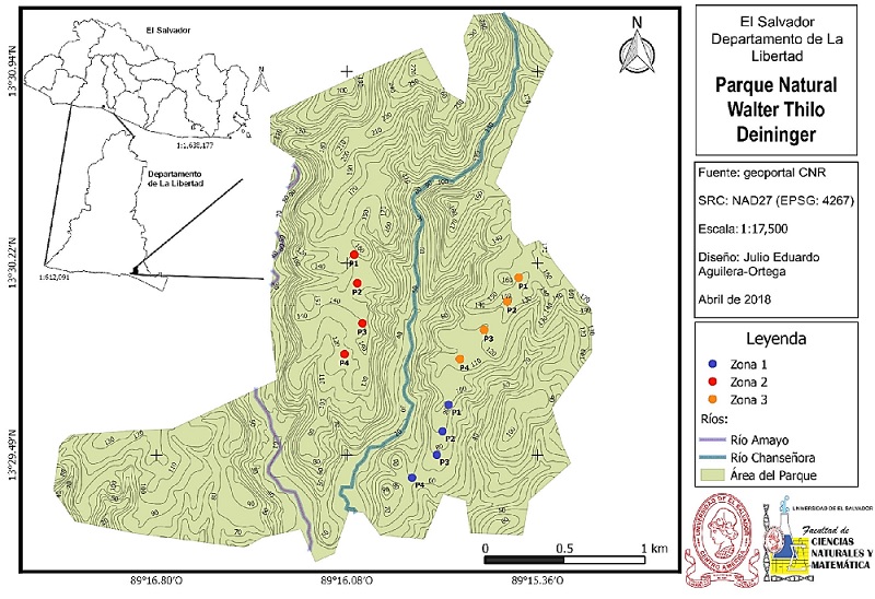 El parque Walter Thilo Deininger está ubicado entre las coordenadas geográficas 13º31’ latitud norte y los 89º16’ longitud oeste; se encuentra a 5 km de la Ciudad de La Libertad, al norte de la carretera del Litoral (Witsberger et al. 1982, ISTU 2017) (Figura 1). Este parque natural está incluido en el Área de Conservación de la Costa del Bálsamo (MARN 2016), cuenta con una extensión de 732 ha, su rango altitudinal parte de los 4 msnm. hasta los 297 msnm (Witsberger et al. 1982, Reyes et al. 1994). Se encuentra dentro de la región climática “sabana tropical caliente o tierra caliente” comprendida entre los 0-800 msnm (clasificación de Köppen, Sapper y Laurer, 1954) y bajo el sistema de clasificación de Holdridge (1975) como “bosque húmedo subtropical, transición a tropical” (Citados por Witsberger et al. 1982, SNET 2017). La temperatura media anual está dentro del rango de los 22º a los 27ºC (Reyes et al. 1994). En la estación lluviosa se registra un promedio anual 1,594 mm de precipitación pluvial (Reyes et al. 1994, SNET 2017).