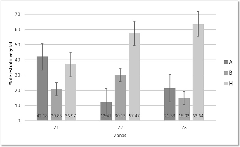 Con estos datos diseñé un gráfico de barras, en el que muestro el porcentaje para cada estrato, y a su vez, bigotes que muestran el error estándar (± EE) para los tres estratos en las zonas estudiadas.