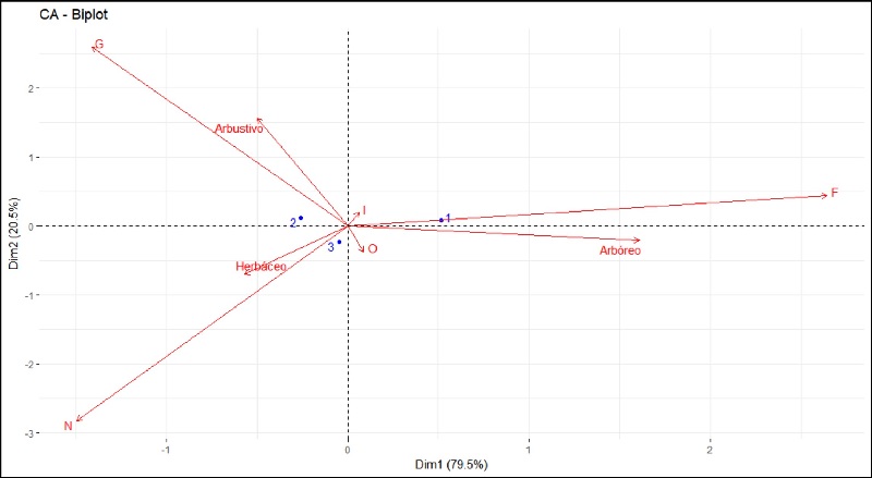 La prueba Chi-cuadrado de independencia aplicada para interpretar el significado del Análisis de Correspondencia (CA) mostró una fuerte asociación entre las variables de vegetación y la ocurrencia de gremios tróficos (x2 = 143.052, P < 0.01). El 100% de los datos estuvieron explicados en las dos dimensiones del CA, de las cuales la dimensión 1 explica el 79.5% de la variabilidad, mientras que la dimensión 2 el 20.5% (Figura 4). La Z2 estuvo relacionada principalmente con el estrato arbustivo y con el gremio de los granívoros, mientras que la Z3 mostró una fuerte asociación con el estrato herbáceo y con la ocurrencia de especies de aves nectarívoras. En cuanto a la Z1 el CA la agrupa en estrecha relación con el gremio de los frugívoros y el estrato arbóreo. Los resultados tanto para el gremio de los insectívoros como para los omnívoros no son concluyentes, puesto que en ambas dimensiones sólo se explica el 5.2% y 8.56% de la variabilidad, respectivamente, lo cual indica que la ocurrencia de estas aves está condicionada por otros factores no incluidos en este análisis (Cuadro 1).