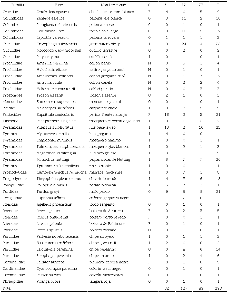 En todas las zonas de estudio registré 298 individuos, agrupados en 18 familias y 43 especies. El 50% de todos los individuos de aves estuvo concentrado en cuatro familias, de éstas, la más representativa fue la Tyrannidae con el 20% del total, seguido de las familias Columbidae (11%), Cuculidae (10%) y Troglodytidae (9%). Las especies más abundantes fueron Crotophaga sulcirostris (garrapatero pijuy) y Pitangus sulphuratus (luis bien te veo) del gremio de los insectívoros, seguidas por Eupsittula canicularis (perico frente naranja) (frugívoros) y Turdus grayi (mirlo pardo) (omnívoros) (Cuadro 1).