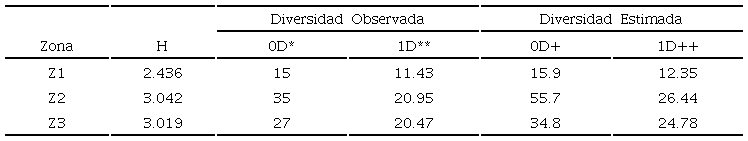 Con base en el estimador para la diversidad de orden 1 (q = 1) determiné que los muestreos en las tres zonas fueron adecuadamente representativos (Z1 = 93%, Z2 = 79% y Z3 = 83%). A su vez, con los valores dados por el índice de diversidad verdadera, es posible estimar la magnitud de la diferencia de diversidad entre una zona y otra. Los números efectivos de especies estimados de Z2 comparados con Z1 indican que la primera comunidad es más del doble (2.14 veces) de diversa que la primera, es decir, Z1 sólo posee el 47% de la diversidad efectiva que posee Z2. Esta tendencia se mantiene al comparar los datos obtenidos en Z3, la cual es 2.00 veces más diversa que Z1, por tanto, esta última posee únicamente el 50% de la diversidad efectiva que la primera. Las comunidades Z2 y Z3 fueron muy parecidas, puesto que únicamente difirieron 6% en diversidad verdadera.