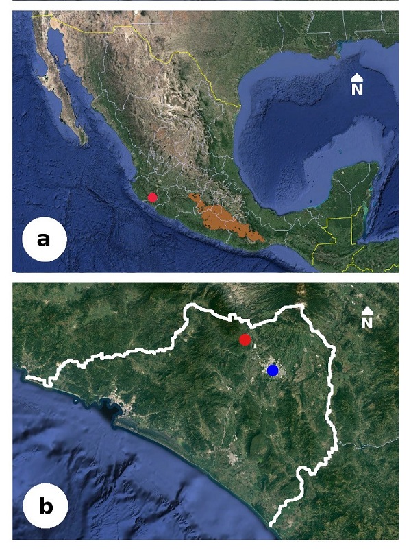 Registramos a la especie durante un estudio ecológico en la comunidad Nahua de Zacualpan, perteneciente al Municipio de Comala, Colima (Figura 1). En esta área predomina un clima cálido subhúmedo con lluvias en verano, una temperatura media anual de 25.6°C y precipitación total anual de 962 mm (INEGI 2017). El paisaje es montañoso; en su zona alta es posible encontrar bosques de pino-encino, mientras que la parte baja está conformada por selva baja caducifolia, plantaciones de ciruela, cultivos de maíz y asentamientos humanos. El pastoreo vacuno y caprino que mayormente se practica en la comunidad es de tipo extensivo, por lo que existe un impacto significativo de la actividad ganadera sobre la vegetación nativa. El territorio comunitario colinda con la Reserva de la Biosfera Sierra de Manantlán, la cual es una de las áreas naturales protegidas más extensas e importantes por su biodiversidad en el oeste de México (INE 2000).