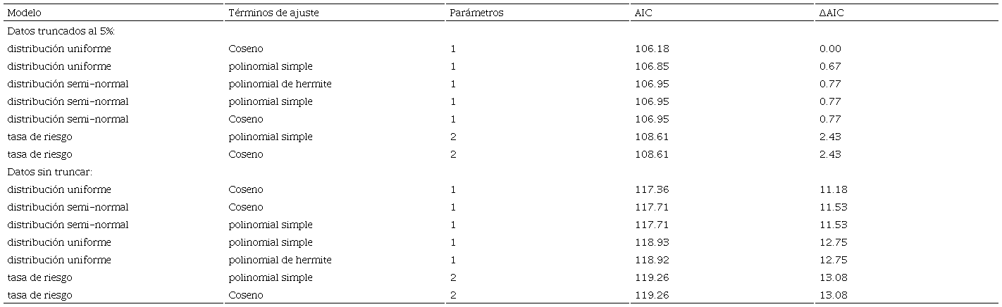 Valores del Criterio de Información Akaike´s para los modelos de la función de detección evaluada en el programa Distance.
