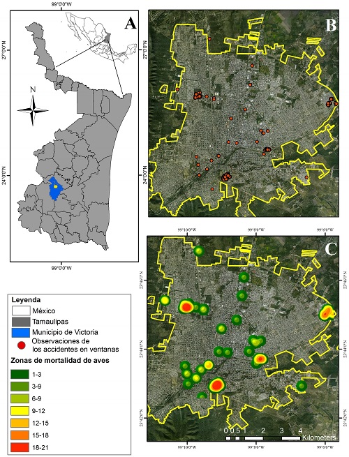 Se utilizó la herramienta Kernel Quartic (biponderado) predeterminado en el programa ArcMap 10.2.2. para generar un mapa de densidad de aves muertas o accidentadas en las ventanas de los edificios de Ciudad Victoria. Se aplicó el modelo de distribución binomial que consiste en un experimento aleatorio en el que solo puede dar dos posibilidades que ocurra un determinado suceso, en este caso, de que ocurra una colisión. Para este análisis se tomó en cuenta el valor total de las colisiones en el área (n=474individuos) y el número de colisiones de cada una de las especies. En este caso, éxito o probabilidad alta de colisión, será considerado cuando una especie tenga un valor de P<0.05 y fracaso o una baja probabilidad de una colisión, será considerado cuando una especie tenga un valor de P>0.05.