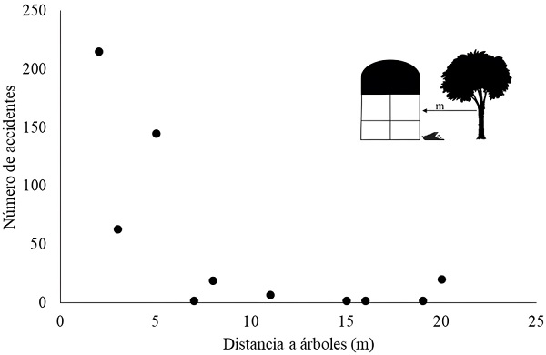 Así mismo, hubo diferencias significativas entre las estructuras en el número de ejemplares de aves accidentadas (χ2162= 243.9, P < 0.05). El cristal de tipo reflectante causó la mortalidad de 401 ejemplares, mientras que el cristal de tipo transparente generó una mortalidad menor de 59 ejemplares, en comparación, la pared blanca obtuvo 14 registros. Otra característica que influyó en la mortalidad de las aves fueron los árboles cercanos que se reflejan en las ventanas de los edificios. Hubo una correlación negativa alta (r = -0.67, gl= 8, P < 0.05) del número de aves accidentadas con la distancia desde la ventana al árbol cercano. El mayor número de choques (423 ejemplares) ocurrieron donde hay árboles a distancias cortas de 2-5 m desde las ventanas (Fig. 3). Por otro lado, hubo pocos accidentes de aves contra las ventanas cuando los árboles se encontraban a >8 m de distancia (Fig. 3).