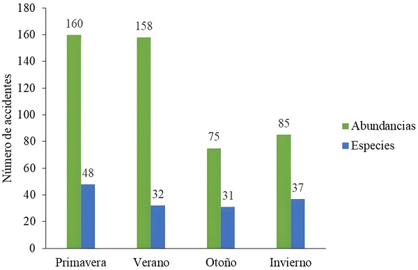 Se identificó que existen diferencias significativas entre estaciones del año (χ2= 294, P < 0.05).Las estaciones de primavera y verano se registraron el mayor número de 158 - 160 aves en colisión con los edificios (Fig. 4). Por otro lado, en el otoño e invierno hubo menor número de 75 - 85 aves en colisiones. En cuanto al número de especies, no vario mucho entre temporadas, a excepción de primavera cuando hubo un poco más especies afectadas (Fig. 4).