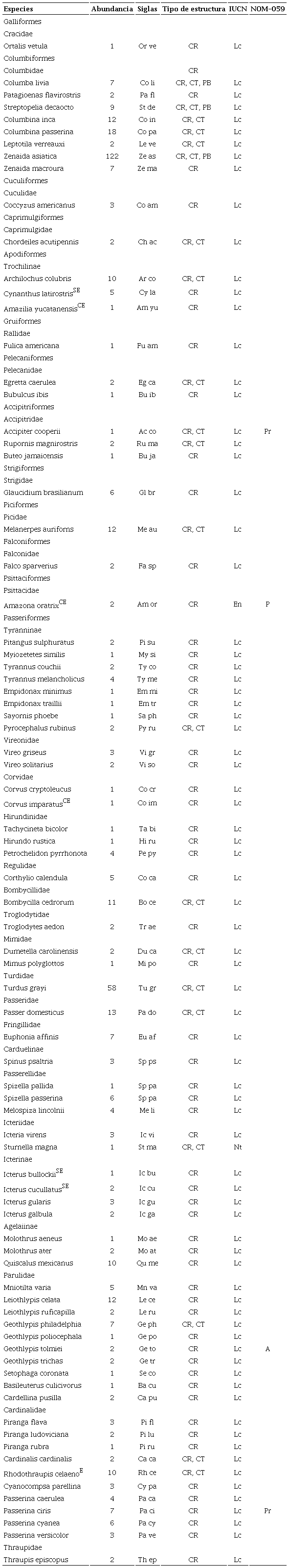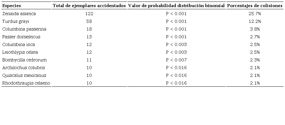 En total se obtuvieron 474 registros de accidentes de aves, correspondiendo a 82 especies de aves, que se impactaron contra las ventanas de los edificios o viviendas (Tabla 1). De éstas, se identificaron dos especies (Zenaida asiática y Turdus grayi) con una alta frecuencia de colisión y representaron el 37.9% de las colisiones (Tabla 2). Del total de las especies afectadas, se identificaron cinco especies bajo alguna categoría de riesgo (Tabla 1). Al nivel internacional, se obtuvieron dos especies en la lista roja: Amazona oratrix considerada en peligro de extinción y Sturnella magna como casi amenazada (IUCN 2022). Al nivel nacional hubo cuatro especies clasificadas en la NOM-059 (SEMARNAT 2010): Amazona oratrix en peligro de extinción; Geothlypis tolmiei considerada amenazada; además de Accipiter cooperii y Passerina ciris en la categoría protección especial. En este mismo sentido, se determinaron siete especies con diferentes grados de endemismos para México (Tabla 1). Entre ellas una endémica (Rhodothraupis celaeno) tres semiendémicas (Cynanthus latirostris, Icterus bullockii e Icterus cucullatus), tres cuasiendémicas (Amazilia yucatanensis, Amazona oratrix y Corvus imparatus).