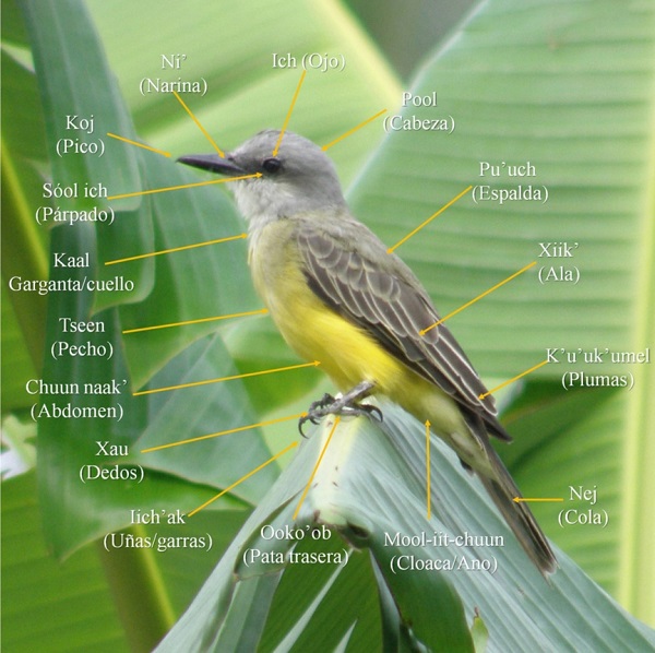 Documentamos en el presente estudio el reconocimiento por los mayas yucatecos de las estructuras morfológicas para las aves, tanto las específicas como las compartidas con otros grupos faunísticos. El reconocimiento y nombramiento de las estructuras morfológicas constituyen los elementos primarios de percepción individual y colectiva para ubicar y ordenar a la diversidad de especies aviares que habitan en una región como parte de una forma de vida animal. Así, el nivel cognitivo de la morfología externa es un criterio descriptor y diferenciador entre grupos animales, que funciona como un elemento de clasificación, es decir, los caracteres morfológicos prototípicos son los elementos identitarios que mejor explican un dominio animal (Brown y Chase 1981, Quinlan 2005, Sierra 2009, Balée y Nolan 2015, Miller y Doolittle 2017). No obstante, se ha registrado que los caracteres morfológicos prototípicos de las aves (pico, alas y plumas), no necesariamente son utilizados en los sistemas de clasificación folk, ya que la avifauna (residente o migratoria) de una región puede ser categorizada multidimensionalmente con base en criterios o propiedades vinculadas a su importancia cultural, tipo de hábitat en el que se observan, comportamiento, locomoción, o hábitos alimentarios (Brown 1982, Berlin 1992, Toledo y Argueta 1993, Descola 2001, Rojas 2002, Alcántara-Salinas et al. 2013).