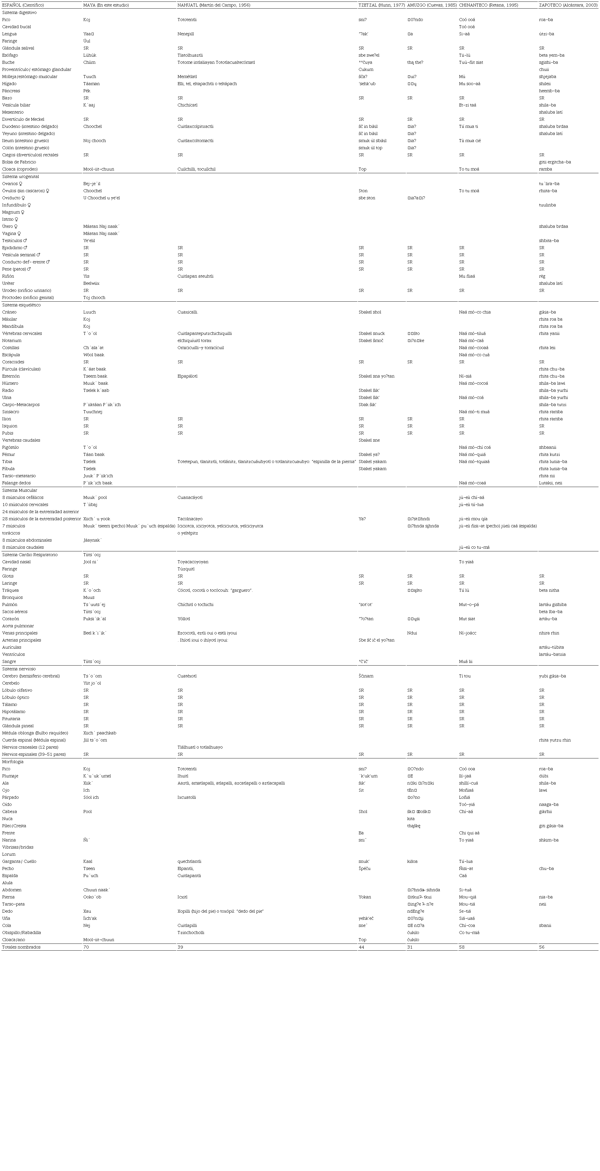 En este estudio documentamos una de las nomenclaturas indígenas más completas para la morfología y anatomía de la clase Aves (70 nombres). Otros estudios realizados en México han reportado para una comunidad zapoteca 56 nombres (Alcántara-Salinas 2003), chinanteca 58 nombres (Retana 1995), y amuzga 31 nombres (Cuevas-Suárez 1985). Por otro lado, se documentaron 105 y 164 términos utilizados por los tzeltales (Hunn 1977) y mexicas (Martín del Campo 1956) respectivamente, para designar la anatomía y morfología de los animales y del humano mismo, consideradas como las terminologías más amplias que se han documentado para grupos indígenas de México.