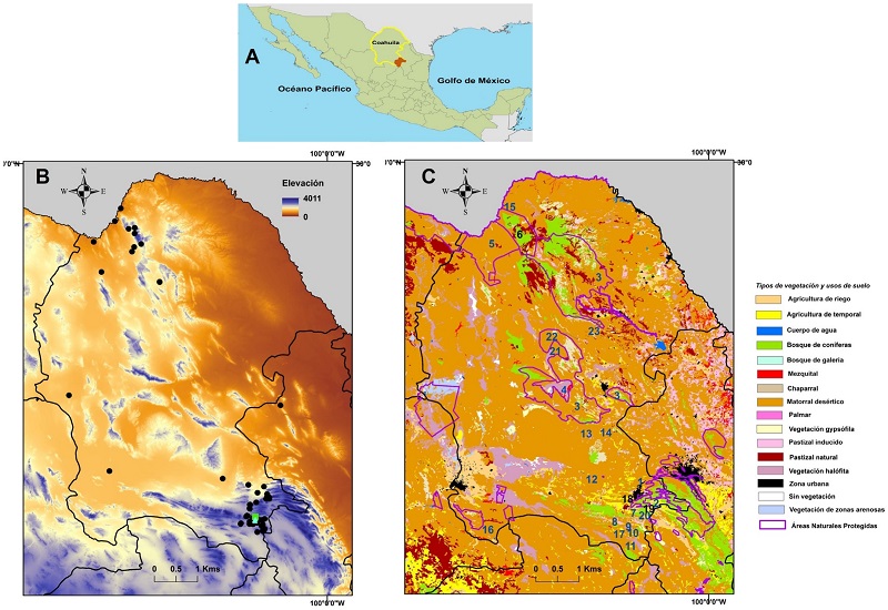 Nuestros registros de observaciones, además de los reportados en bases de datos y literatura en diferentes áreas de Coahuila, evidenciaron la presencia en mayor medida de individuos de A. chrysaetos en la parte noroeste y sureste de Coahuila, ubicados a mayores altitudes (Fig. 1B) con una media de 1,947 ± 458 m s.n.m. (rango: 665 - 2,775 m s.n.m.), en zonas con vegetación de matorral desértico y pastizales naturales (Fig. 1C). En Coahuila existen 24 Áreas Naturales Protegidas que presentan condiciones climáticas adecuadas para A. chrysaetos (Tabla 2, Fig. 3). La modelación en MaxEnt indicó que el patrón de distribución de A. chrysaetos se encuentra en la parte noroeste (abarcando ANPs como Maderas del Carmen), centro (abarcando ANPs como Don Martín y Cuatro Ciénegas) y sureste (abarcando ANPs como Sierra de Arteaga y Sierra de Zapalinamé) y, en menor medida, en la parte noreste y suroeste (donde se ubican ANPs como Mapimí). Esto es debido a que estas últimas áreas presentan grandes extensiones de agricultura de temporal, matorral desértico y pastizales (o zacatal) inducido (Fig. 1C).