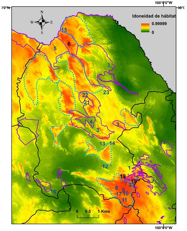 Resumen: El Águila Real (Aquila chrysaetos) es una rapaz amenazada a nivel nacional, que se distribuye desde el norte del país hasta el centro de México. Sin embargo, existen escasos reportes de su presencia dentro del rango de distribución en México, como es el caso para Coahuila. Hicimos observaciones en campo en la región sureste de Coahuila durante el periodo de 2017 al 2023, complementada con una revisión de los registros de monitoreo en campo en diferentes bases de datos. Con estos registros, generamos una modelación de idoneidad ambiental para Aquila chrysaetos utilizando el algoritmo MaxEnt para identificar zonas prioritarias para la conservación que no se encuentran dentro de un área natural protegida. Los registros encontrados de individuos de A. chrysaetos evidenciaron en gran medida que la mayor probabilidad de ocurrencia se encuentra en la parte noroeste y sureste de Coahuila en zonas de matorral desértico y pastizal natural. El modelo de idoneidad climática indicó que las zonas prioritarias para conservación se ubicaron adyacentes a las áreas naturales como Maderas del Carmen, Sierra de Arteaga, Sierra de Zapalinamé, Ocampo y Don Martín. Nuestra modelación de la idoneidad climática para A. chrysaetos nos permitió identificar zonas prioritarias para la conservación que no se encuentran dentro de un área natural protegida, lo que implica que estas zonas idóneas para que habite A. chrysaetos sean consideradas prioritarias para la conservación de la especie.