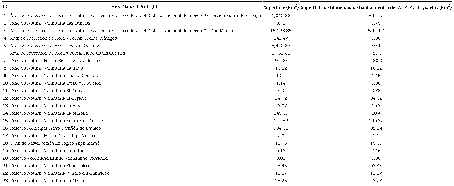 Después de identificar las áreas de mayor idoneidad climática para A. chrysaetos, realizamos un análisis espacial para la estimación de las áreas climáticamente estables para la especie y la estimación del porcentaje de área distribución potencial de la especie incluida dentro de algún área protegida. Para determinar la importancia del sistema de Áreas Naturales Protegidas (ANPs) en la conservación del A. chrysaetos (Figueroa y Sánchez-Cordero 2008), calculamos la proporción (en km2) de las áreas de distribución potencial de esta especie dentro de las ANPs. Para ello, comparamos los mapas de distribución de la especie con los polígonos de vegetación y uso del suelo serie VII del INEGI (https://www.inegi.org. mx/temas/usosuelo/), distribución de las ANPs obtenidos del portal Protected Planet (https://www.protectedplanet.net/en), de la Comisión Nacional de Áreas Naturales Protegidas (http://sig.conanp.gob.mx/) y de la Secretaria del Medio Ambiente del Estado de Coahuila (https://sma.gob.mx/anp/).