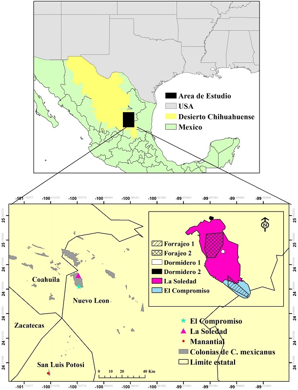 Llevamos a cabo los muestreos del chorlo llanero en tres colonias de perrito llanero mexicano localizadas dentro de la Pradera de Tokio (Fig. 1). El Llano de La Soledad (23°53’N-100°42’W) comprende 6,569 ha y es Área Natural Protegida Estatal (Periódico Oficial 2002), Sitio de Importancia Internacional para la Conservación de las Aves Playeras (WHSRN 2005) y Área de Importancia para la Conservación de las Aves (Arizmendi-Arriaga y Márquez-Valdelamar 2000). Los otros dos sitios fueron El Compromiso (24°48’N-100°40’W) de 1,272 ha, y el Manantial (24°09’N-100°55’W) con 364 ha. La suma de estos tres sitios dan una superficie total de 8,205 ha, las cuales son ocupadas por las colonias de perritos de la pradera mexicano. Los dos sitios de El Llano de La Soledad y El Compromiso están localizadas en el municipio de Galeana, Nuevo León, ambas siendo consideradas como hábitats conservados. El tercer sitio del Manantial pertenece al municipio de Venegas, San Luis Potosí y es la colonia de perrito llanero mexicano más sureña conocida (Scott et al. 2004, Carrera-Máynez 2008).
