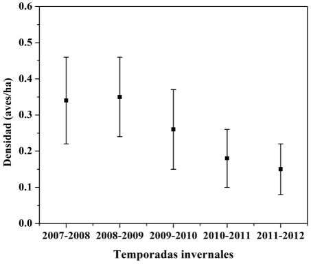 El modelo general para las cinco temporadas basado en el menor AIC, fue el seminormal (media normal/coseno: 2,492 AIC), estimando una densidad de 1.28 chorlos llaneros/ha (IC95%: 1.02- 1.60 ind/ha, CV: 0.11). Sin embargo, se observó una tendencia en la disminución de la densidad de chorlos durante las cinco temporadas de muestreo (Fig. 2). Durante la primera y segunda temporada, registramos densidades similares de 0.34 chorlos llaneros/ha (IC95%: 0.46 - 0.22 ind/ha; AIC: 708) y 0.35 chorlos llaneros/ha (IC95%: 0.46 - 0.24 ind/ ha; AIC: 633), respectivamente. Sin embargo, para la tercera temporada en 2009-2010, la densidad de chorlos disminuyó a 0.26 chorlos llaneros/ha (IC95%:0.37 - 0.16 ind/ha; AIC: 348) y continuó declinando en los subsecuentes temporadas (Fig. 2), llegando a una densidad de 0.15 chorlos llaneros/ha (IC95%: 0.08 - 0.22 ind/ha; AIC: 374) en la última temporada.