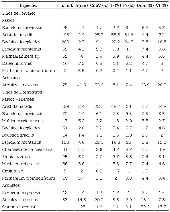 En cuanto a la composición de la comunidad vegetal, los sitios de forrajeo presentaron una estructura vegetal dominada por pastos (Tabla 1). Sin embargo, los pastos tuvieron una menor contribución a la cobertura con 46.1% de la comunidad vegetal con un valor de importancia (VI) donde sobresale Aristida haradii (25.7% CobV, 30.0% VI) y Buchloe haradii (9.1% CobV, 16.8% VI). Sin embargo, también se presentaron fragmentos del arbusto Atriplex cannescens que tuvo una cobertura del 53.9% y valor de importancia de 26.5% en la comunidad vegetal. En el caso de los sitios de dormidero, se registró la mayor riqueza de herbáceas con 12 especies y 3 especie arbustivas (Tabla 1). Por tanto, la cobertura fue de 76.2% y dos especies de herbáceas obtuvieron los valores mas altos de cobertura vegetal y valor de importancia: Aristida haradii (28.7% CobV, 24.8% VI) y Lepidium montanus (22.1% CobV, 15.2% VI). Asimismo, la cactácea Opuntia joconostle del estrato arbustivo tuvo una dominancia de 52.2% y valor de importancia de 17.7% en la comunidad de los sitios de dormideros, pero contribuyó únicamente 1.9% de la cobertura vegetal (Tabla 1). De todas las variables de vegetación, solo detectamos diferencia significativa en la cobertura vegetal, siendo mayor en los sitios de dormidero (t = 0.97; gl = 20, P < 0.05)