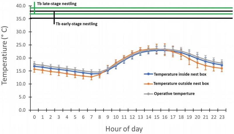 Extreme high ambient temperatures were recorded during the afternoon (Fig. 1), with the highest ambient temperature of 25.0°C - 25.2°C inside the nest-box between 16:00 and 18:00 hrs, and the highest temperatures of 25.8°C - 28.3°C outside the nest-box recorded between 15:00 and 16:45 hrs. The lowest temperatures both inside and outside the nest-box occurred around day-break (Fig. 1). The lowest temperatures of 12.0°C - 12.2°C inside the nest-box occurred between 06:45 and 08:15 hrs, while temperatures of 10.4°C - 10.8°C outside the nest-box occurred between 06:00 and 07:45 hrs. This indicates that the timing of extreme temperature differs by type of environment, with lowest and highest temperatures occurring earlier in the day outside the nest-box compared to within the nest-box. This also demonstrates that nestlings face a wide range of temperatures in the nest-box during the day, with fluctuations of up to 13.2°C between the highest and the lowest temperatures recorded.