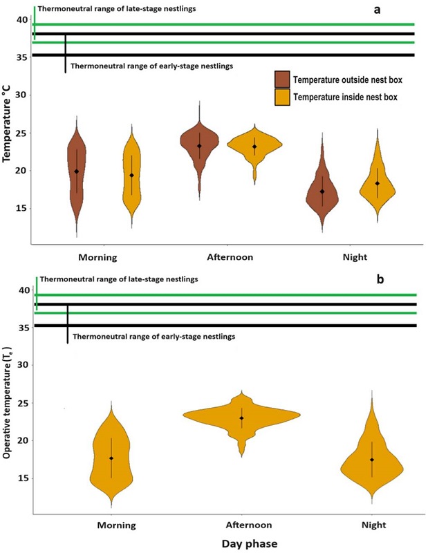 Operative temperatures (Te), representative of those experienced by nestlings in the nest-box environment without parental incubation, fluctuated throughout the day concomitantly with temperature both outside and inside the nest-box (Fig. 1). Likewise, operative temperatures by period of the day followed a similar pattern to that of ambient temperatures, with higher operative temperatures in the afternoon and lower operative temperatures at night and in the morning (Fig. 2b). Operative temperature differed significantly for late-developmental stage models (Estimate = 0.04 ± 0.01 (SE), 95% CI = 0.03 - 0.06; t = 5.6, P < 0.001), with a higher mean 19.2 ± 2.9°C compared to early-developmental stage models (mean: 18.8 ± 3.4°C). The 50% quartile of operative temperature was 16.12°C - 21.9°C, although early-stage models had a slightly lower 50% quartile operative temperature (15.6°C - 21.1°C) than late-stage models (16.5°C - 22.2°C). Overall, both early- and late-stage nestlings had higher body temperatures than ambient temperatures inside the nest-box, and the operative temperatures of models in the nest-box (Fig.1). Therefore, as operative temperature of models closely followed internal ambient temperature it is likely that in the absence of brooding adults, nestlings would experience thermal stress.