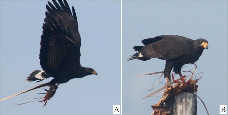 Abstract: Little information exists on the diet of the Common Black Hawk (Buteogallus anthracinus) in Mexico. We provide the first documented observation of predation on a crab by the Common Black Hawk in a mangrove swamp on the coast of Oaxaca, Mexico. On 24 April 2023, at 09:00 h, we observed a Common Black Hawk fly out of the mangrove swamp with a crab between both feet. We observed for 15 mins while the hawk consumed the crab on a post. We identified the Blue Land Crab (Cardisoma crassum) by the characteristic blue color of the shell, and orange claws and belly. Our observation contributes to knowledge of the diet of the Common Black Hawk and its consumption of a crab species that bioaccumulates metals and metalloids. This opens the possibility of conducting research to assess the risk of transfer and bioaccumulation from prey to predator that could compromise the conservation status of this raptor.
