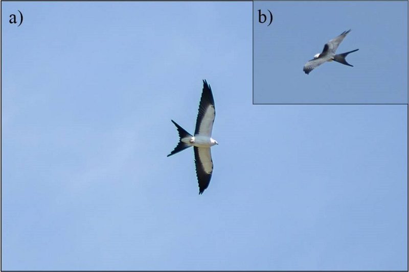 El 28 de septiembre del 2023, me encontraba observando aves en la Presa La Purísima, al llegar a uno de los brazos de la presa cercano al “cerro del sombrero”, me detuve a fotografiar e identificar algunas gaviotas y patos que se encontraban descansando sobre la orilla de la presa. Aproximadamente a las 11:49 h observé una silueta blanca con negro en el noreste (20°53'12.84" N y 101°16'16.31" O), la cual logré ver desde que tenía unos aproximados 5 metros de elevación. De inmediato le tomé diversas fotografías con una cámara fotográfica (canon EOS rebel T7 y objetivo 75-300mm f/4-5.6), posteriormente la observé con binoculares 10 x 42 mm, percatándome que se trataba de un milano tijereta (Fig. 1). El ave comenzó a volar en círculos logrando conseguir elevación a través de la corriente de viento, para finalmente desaparecer de mi vista.