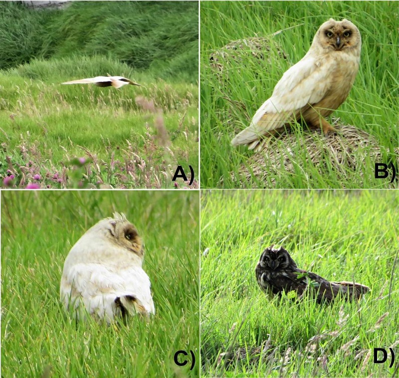 Avistamos un individuo de búho sabanero (A. f. bogotensis) con plumaje atípico el 6 de mayo de 2023, en el aeropuerto de la ciudad de Latacunga (0°53’51.16” S y 78°36’52.42” O), provincia de Cotopaxi, en el valle interandino al norte de Ecuador. El individuo fue observado a las 15:00 h llegando para forrajear en los pastizales junto a la pista, volando a ras de la vegetación y perchándose en el suelo (Fig. 1A-C). Este comportamiento lo realizó en compañía de otro individuo conespecífico de coloración normal (Fig. 1D).